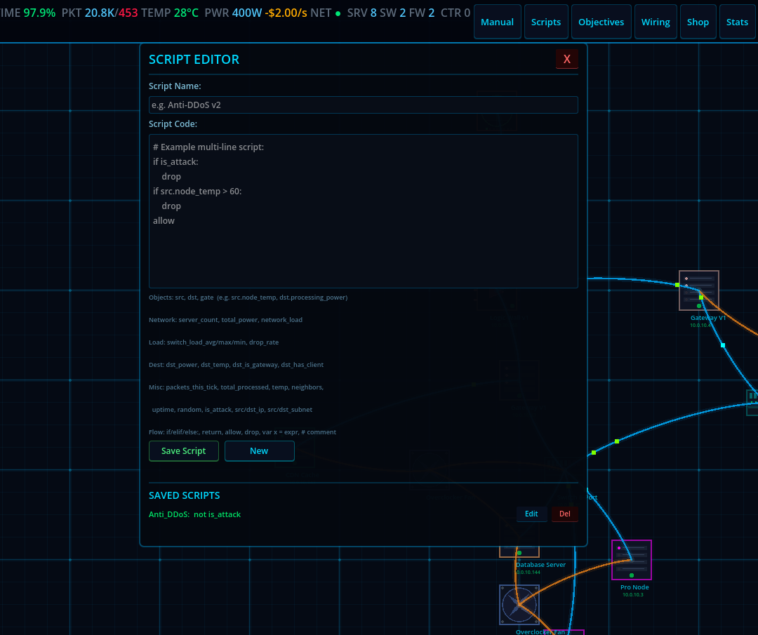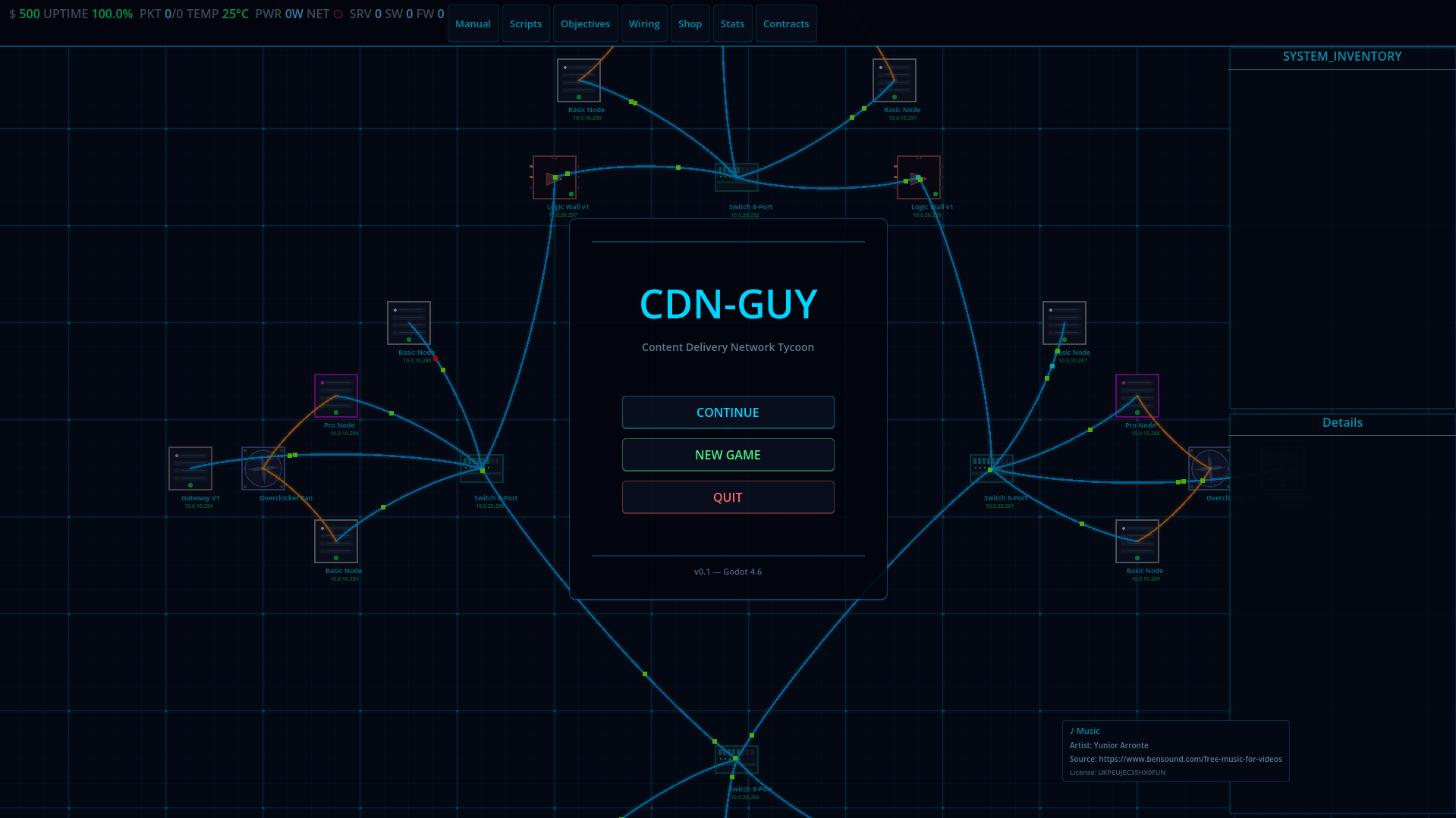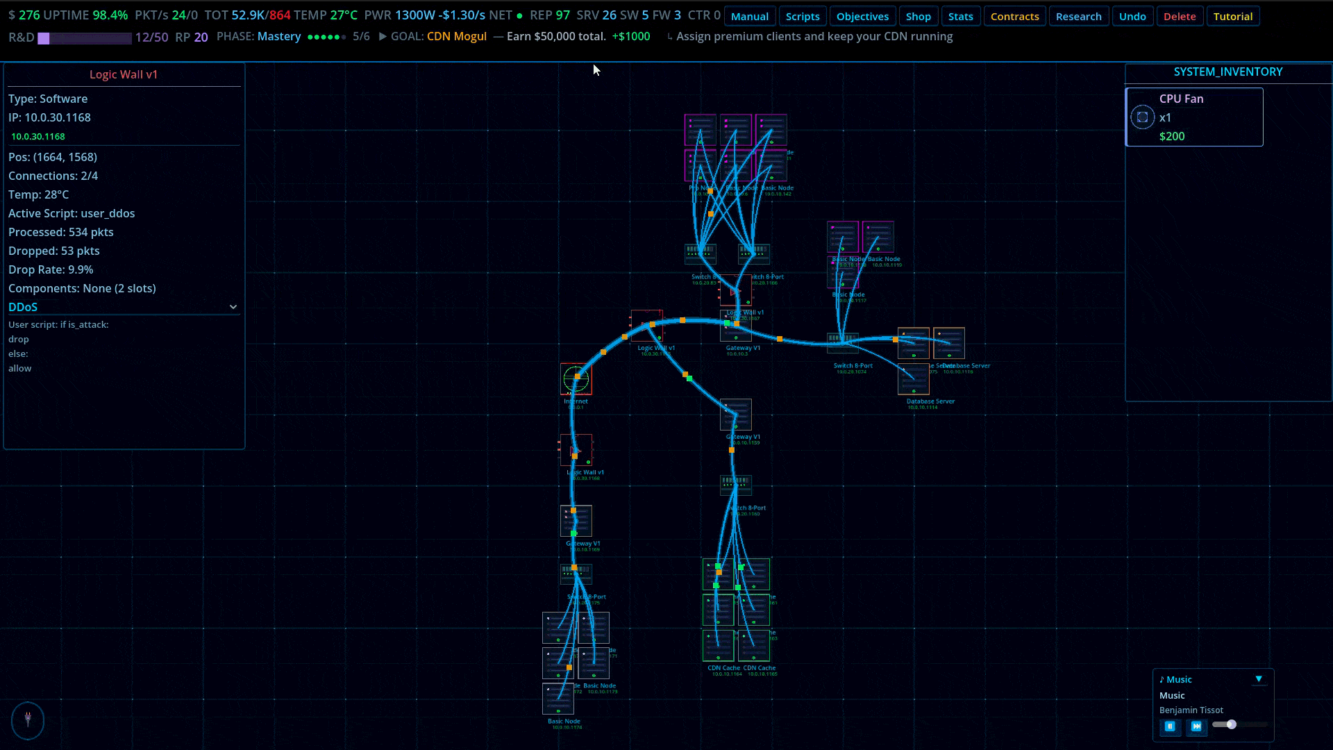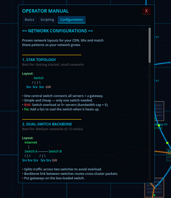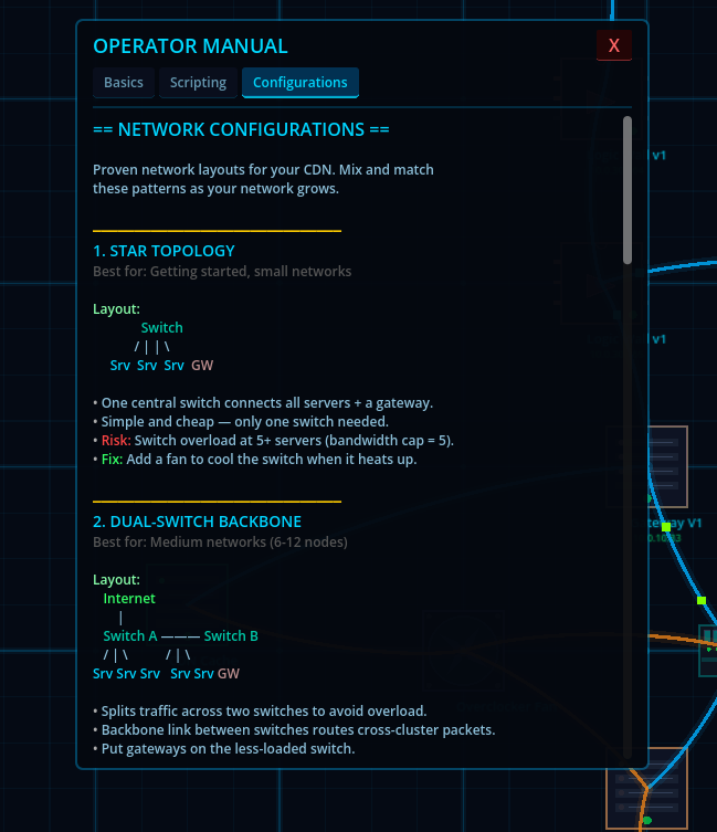 CDN Guy is a network infrastructure game where you design, build, and manage your own CDN from the ground up. Place servers, cooling units, databases, CDN caches, and logic gates on your rack. Wire them together. Write custom routing scripts. Take on contracts. Keep the lights on.
