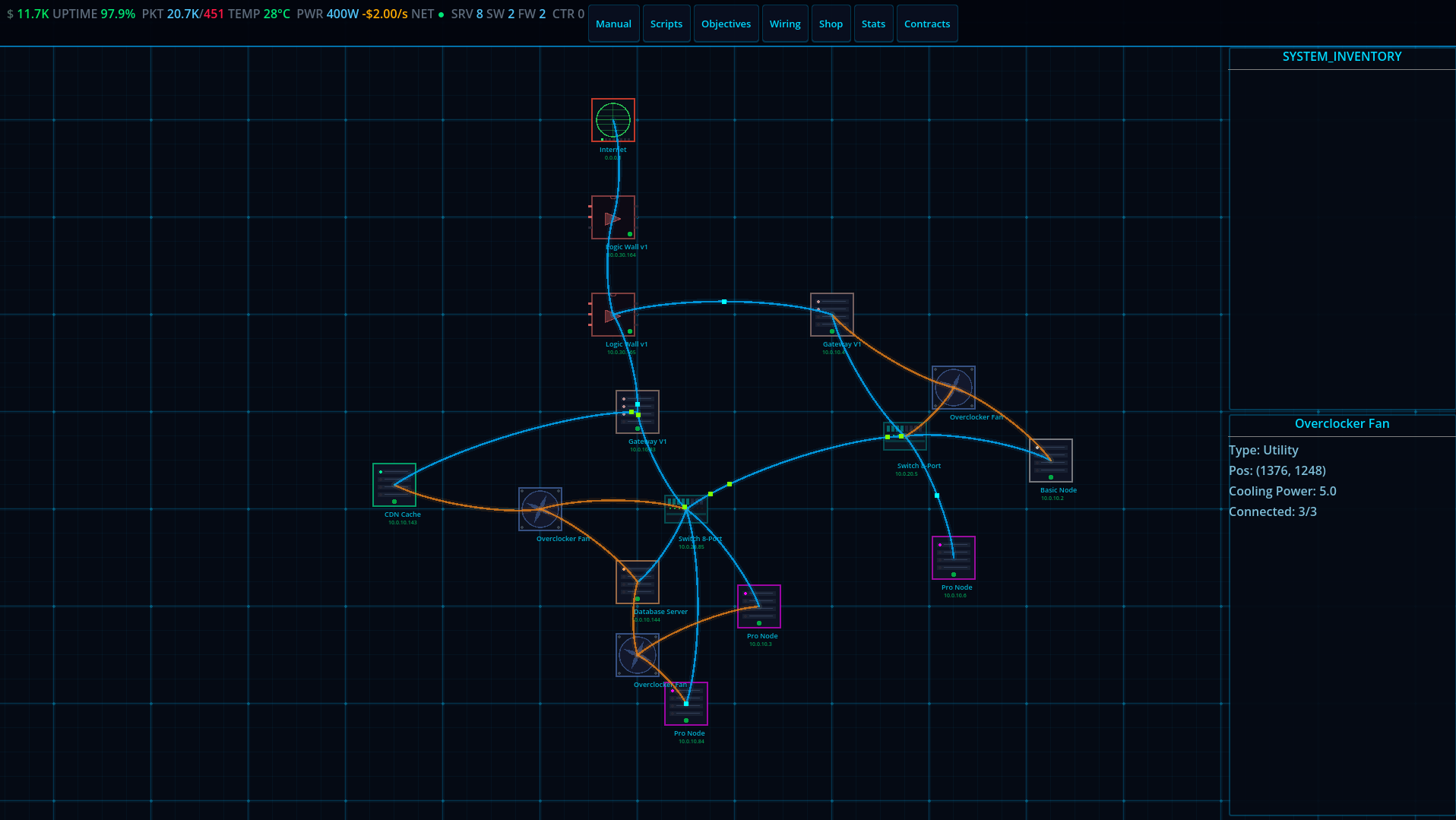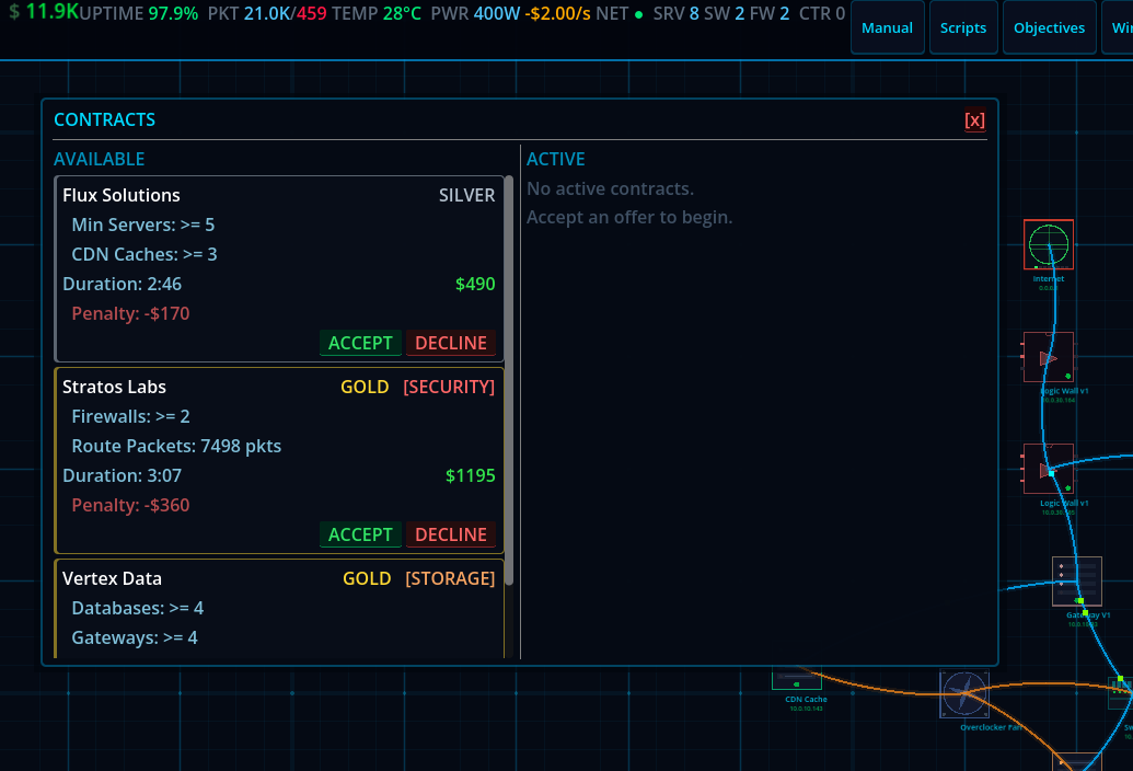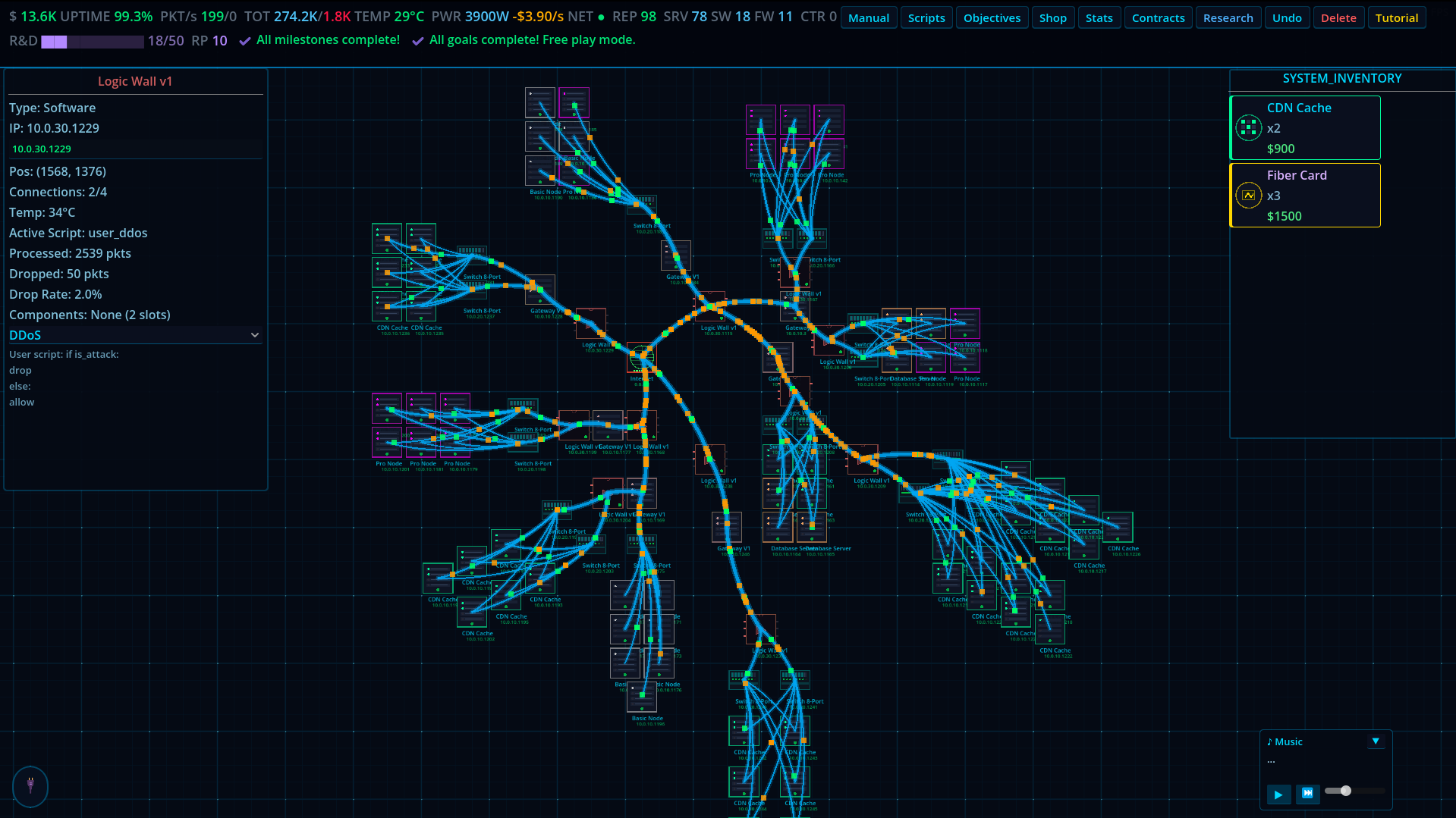 CDN Guy is a network infrastructure game where you design, build, and manage your own CDN from the ground up. Place servers, cooling units, databases, CDN caches, and logic gates on your rack. Wire them together. Write custom routing scripts. Take on contracts. Keep the lights on.